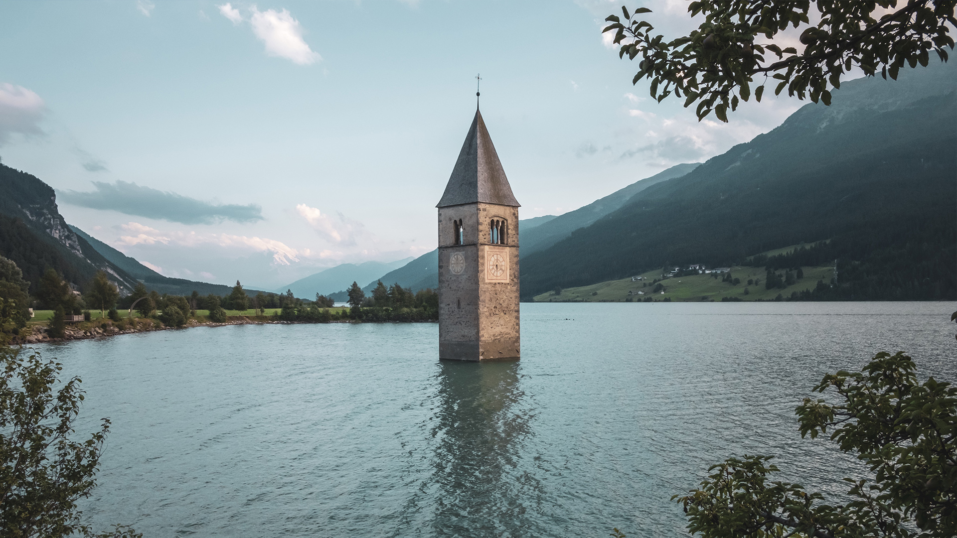 Il viaggio parte da Passo Resia, a 1.500 metri di altitudine, al confine con l’Austria. Proprio qui si trova uno dei simboli più noti dell’Alto Adige: il campanile sommerso della vecchia chiesa di Curon, che emerge solitario dalle acque turchesi del Lago di Resia. Questo luogo racconta la storia del paese sacrificato negli anni '50 per la creazione del bacino idroelettrico.