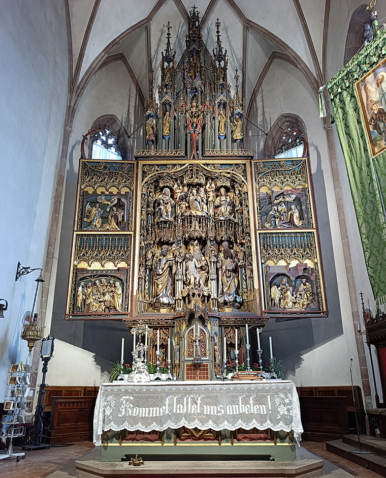 Realizzato interamente in legno di castagno, l’altare di Hans Schnatterpeck, scultore svevo del XV secolo, è un vero colosso artistico: oltre 14 metri di altezza e 7 di larghezza. Ci vollero ben otto anni di lavoro, durante i quali Schnatterpeck, aiutato dai suoi allievi, intagliò con maestria 35 statue mobili, alcune delle quali alte fino a 1,80 metri. Terminato l’intaglio, l’opera fu dipinta a mano e impreziosita con foglia d’oro ducato, conferendole uno splendore che ancora oggi lascia senza fiato.