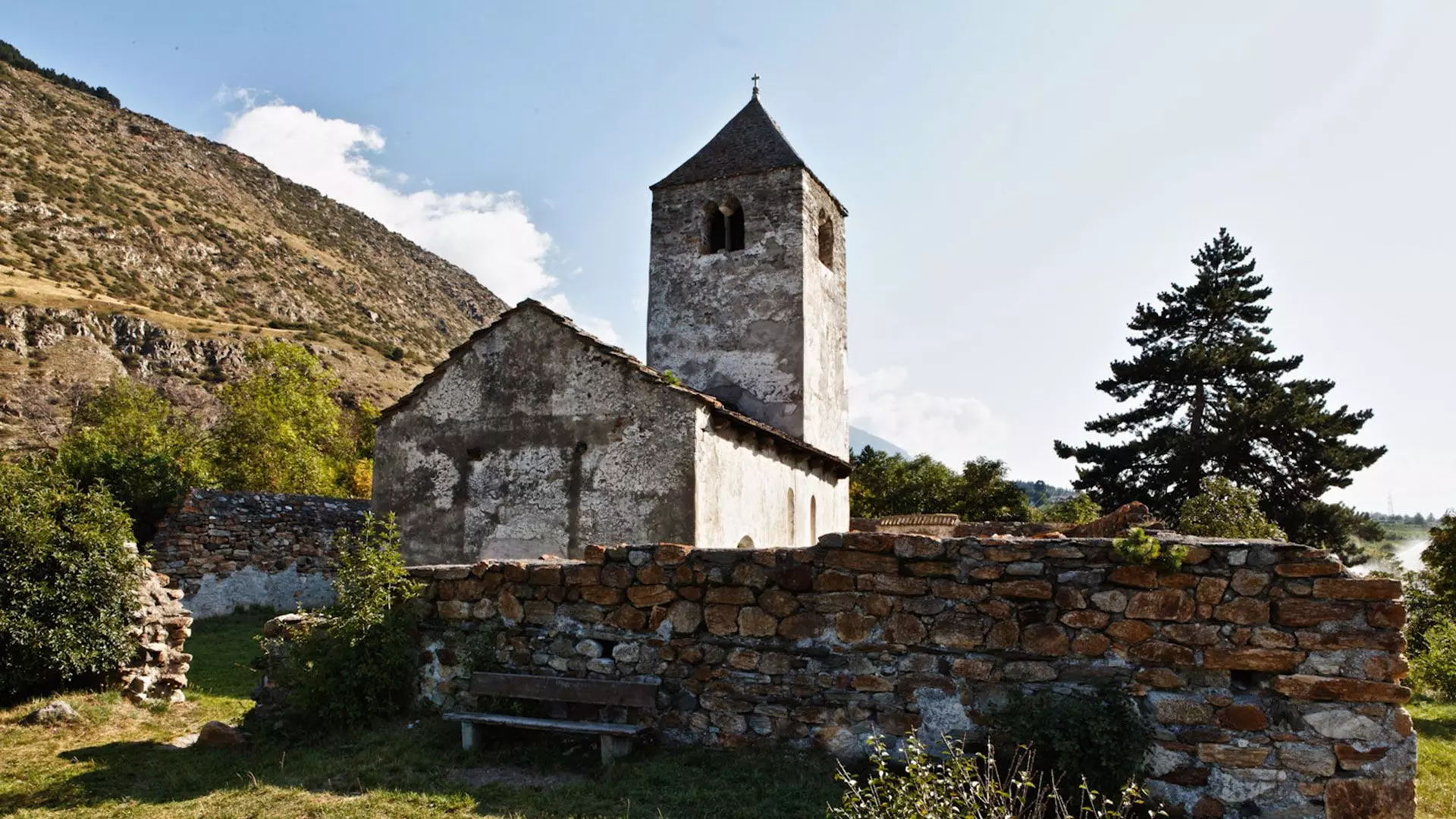 L’abside è divisa in colonne ognuna delle quali contenente tre finestre ad arco, quella centrale è la più piccola. Tra gli elementi decorativi sono da menzionare le lisene (nella parte superiore) e a metà altezza due sculture rappresentanti un leone e un ariete. All’interno l’abside è invece molto semplice e lineare, ad eccezione del suo rilievo, risalente al periodo carolingio, dei tre martiri Santi Alessandrino, Martirio e Sisino.