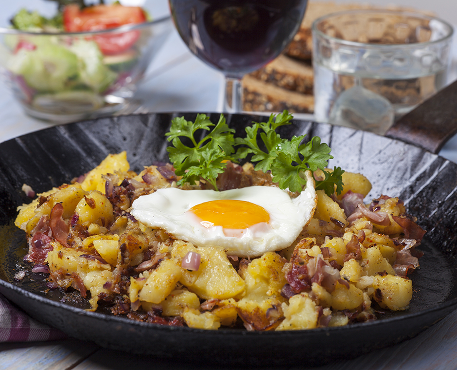 Un piatto semplice ma gustoso della tradizione contadina altoatesina. Uova all’occhio di bue adagiate su un letto di patate saltate in padella con speck croccante. Il contrasto tra dolcezza delle patate, sapidità dello speck e cremosità del tuorlo.