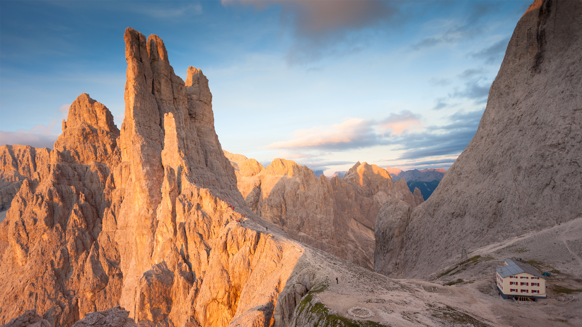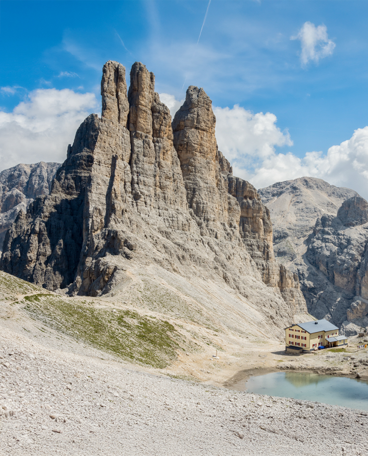 Zwischen grünen Wiesen und steilen Felswänden bietet dieses Panorama die perfekte Kulisse für eine angenehme und bereichernde Wanderung – mit der Möglichkeit, die Natur zu entdecken und in einer der zahlreichen Almhütten wie der Vajolet-Hütte (2243 m) oder der Gartlhütte (2621 m) typische Spezialitäten zu genießen. Letztere gilt als einer der besten Orte, um die Enrosadira zu erleben.