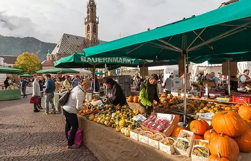 Der Dorfplatz verwandelt sich in einen lebendigen Bauernmarkt mit rund 33 Genussständen, an denen Landwirte und Produzenten frische und gereifte Südtiroler Spezialitäten anbieten: Obst, Gemüse, Säfte, Sirupe, Kräuter, Destillate, Käse, Speck und vieles mehr – zum Verkosten und direkt Kaufen.