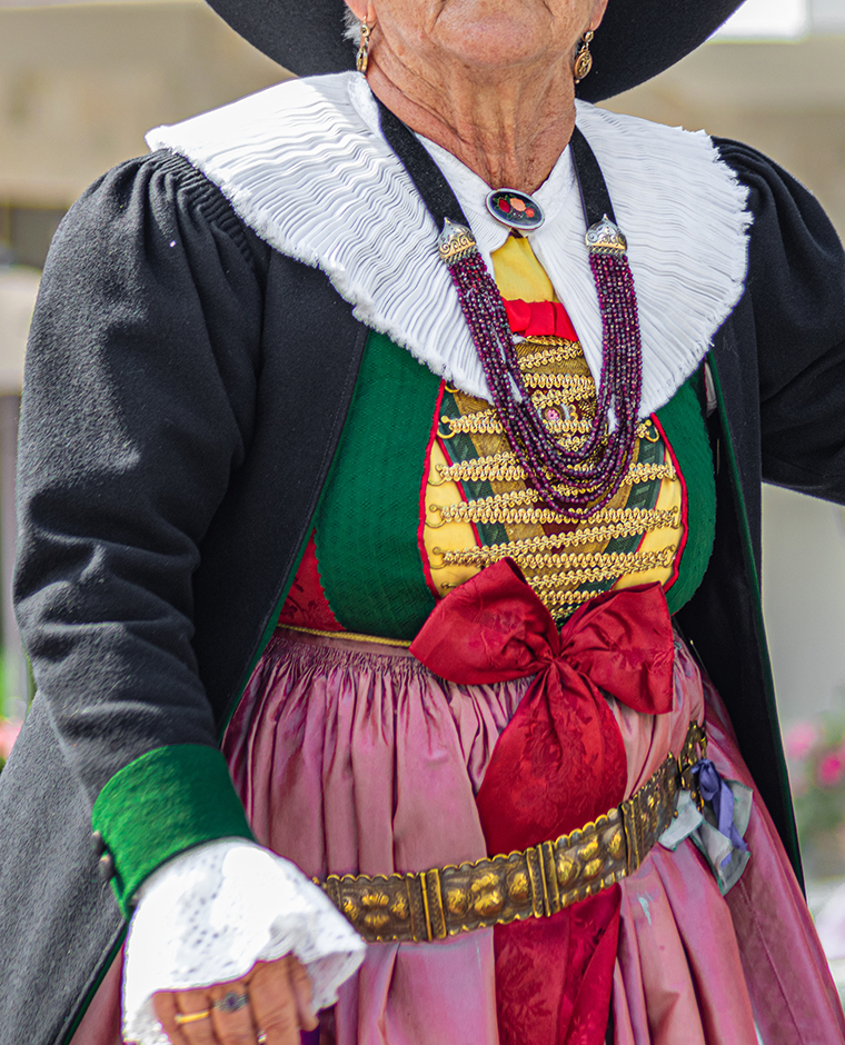 Die traditionelle Grödner Tracht zählt zu den prächtigsten und reichsten ganz Südtirols. Früher war sie nicht nur Festkleidung, sondern ein sichtbares Zeichen der sozialen Rolle und des persönlichen Status. Jedes Detail hatte eine Bedeutung und erzählte etwas über das Leben der Träger:innen – etwa den Familienstand oder das Alter.