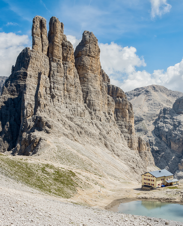 Vom Rifugio Re Alberto folgt man dem Pfad zu den berühmten Vajolettürmen. Nach Erreichen der „Terrasse“ steigt man in die Rinne ab und quert nach links bis zum Einstieg der Torre Delago – ein alpiner Klassiker mit herrlicher Aussicht und viel Geschichte.