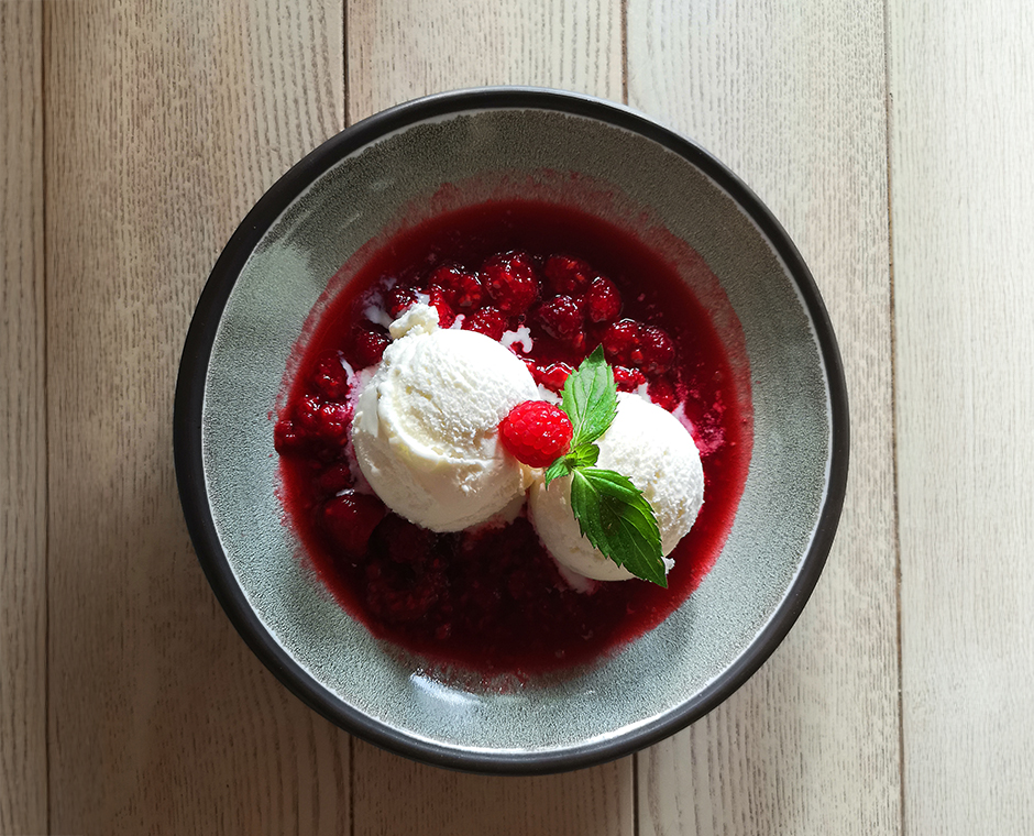 Ein perfektes Spiel aus heiß und kalt: Kugeln von Vanilleeis, serviert mit einer warmen Himbeersauce.