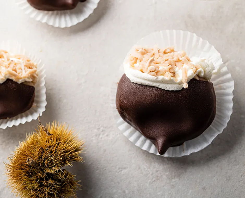 Diese zarten kleinen Desserts bringen den vollen Geschmack der Kastanie zur Geltung. Besonders beliebt in der kühlen Jahreszeit, sind sie mit dunkler Schokolade überzogen – perfekt als Abschluss eines Essens oder zu einem Glas Südtiroler Passito oder Kastaniengrappa.