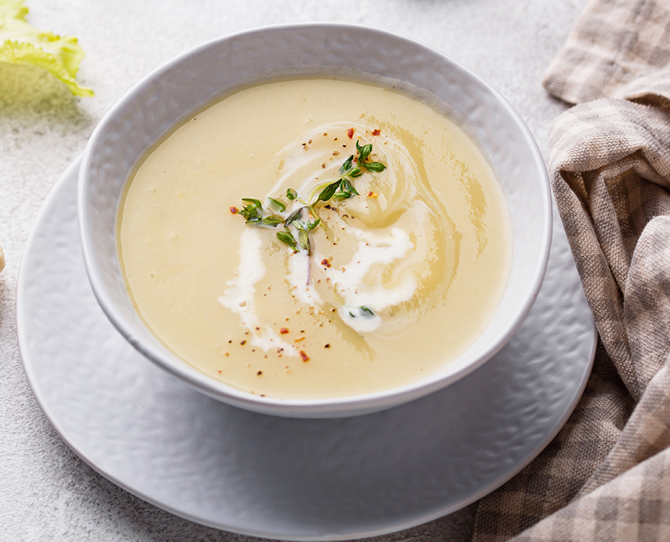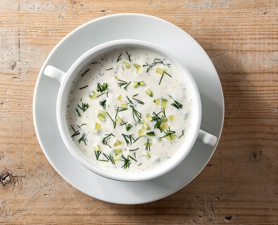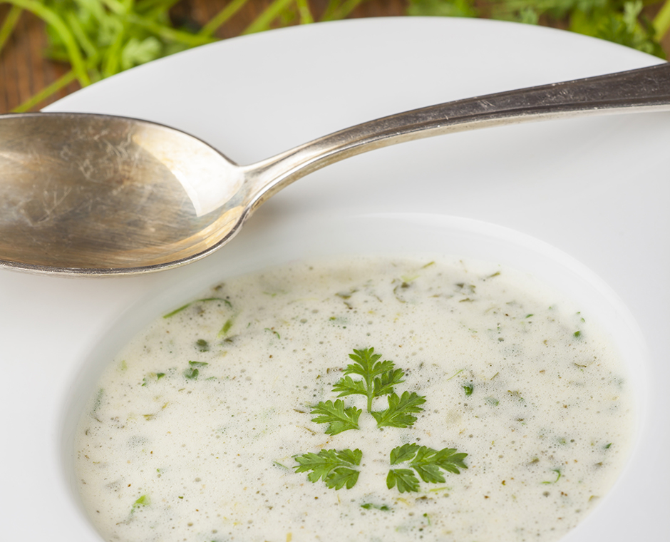 Eine der edelsten Südtiroler Suppen – Sekt und Hühnerbrühe verschmelzen zu einer samtigen Creme, die durch Sahne noch feiner wird.