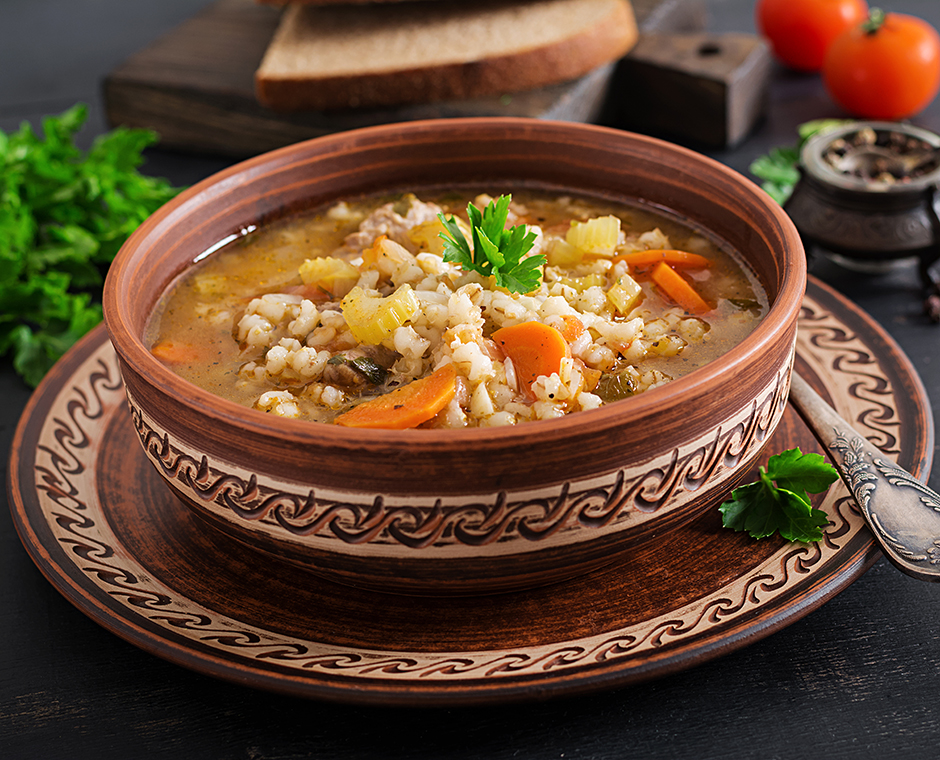 Die Gerste unter fließendem Wasser abspülen. Zwiebel in Butter zusammen mit dem Speck anbraten. Das gewürfelte Gemüse und die Gerste zugeben, mit heißer Brühe aufgießen und bei niedriger Hitze ca. 40 Minuten köcheln lassen. Mit Salz und Pfeffer abschmecken und mit gehacktem Schnittlauch servieren.
