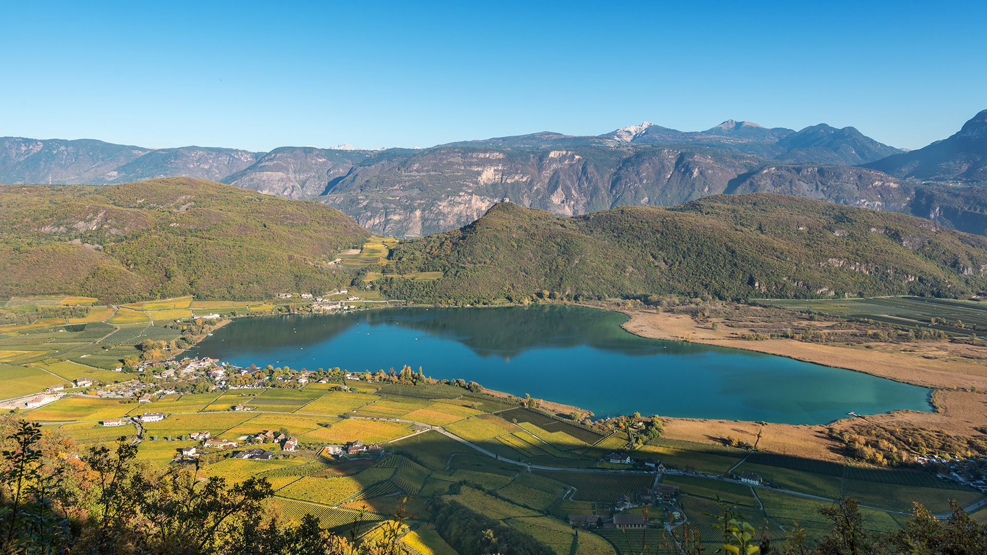 Auf der gegenüberliegenden Seite des Sees erhebt sich der Mendelpass, ein Aussichtspunkt, der über eine kurvenreiche Straße mit dem Auto oder mit der historischen Mendelbahn erreichbar ist – eröffnet im Jahr 1903. Sie ist die längste und steilste Standseilbahn Europas und eine Attraktion für sich. Sie verbindet Kaltern mit dem Hochplateau über dem Ort, das einst ein beliebter Sommerfrische-Ort der mitteleuropäischen Aristokratie war.