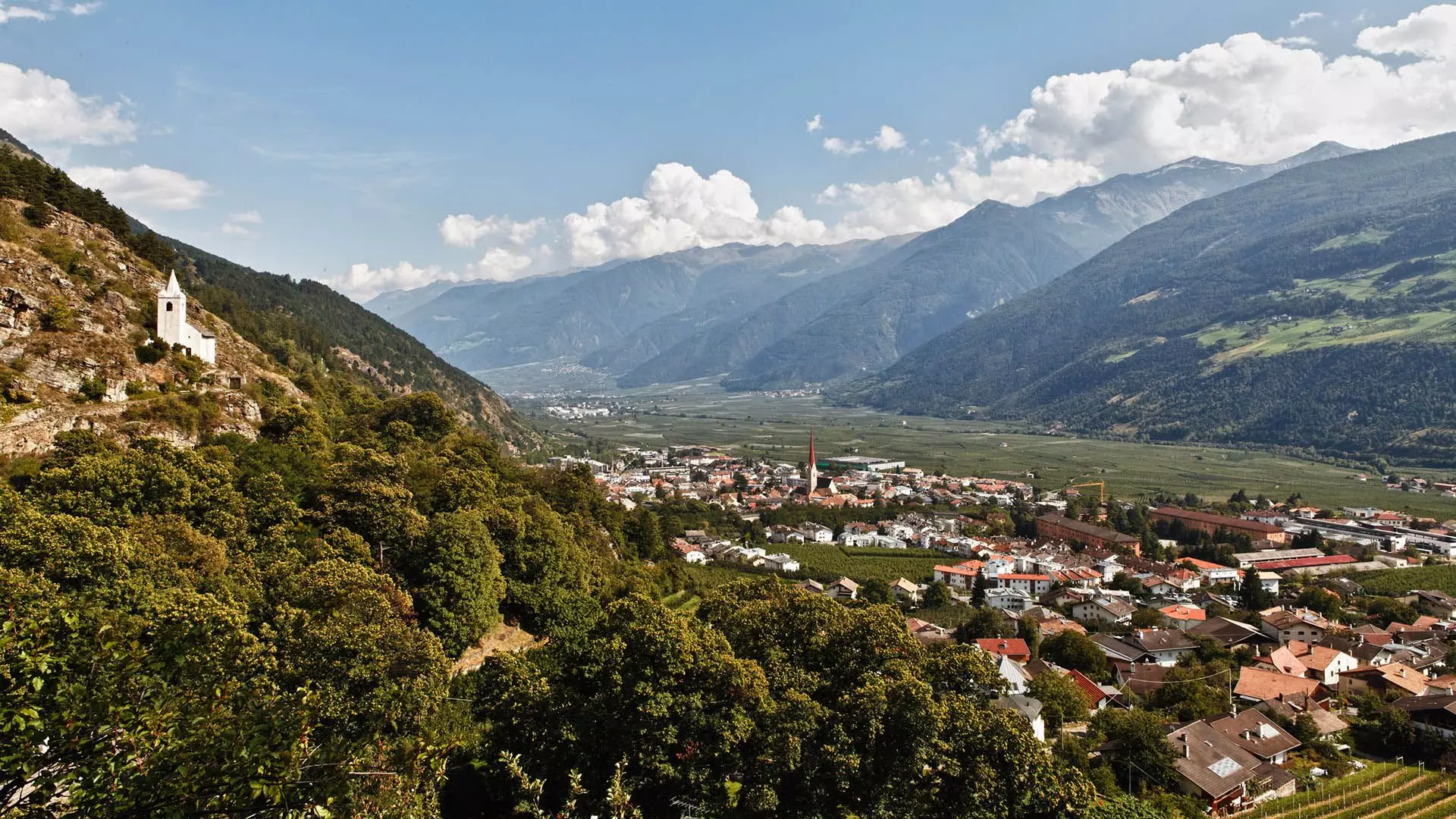 Von oben betrachtet wirkt Schlanders wie ein harmonisches Mosaik vielfältiger Landschaften. Am Sonnenberg gedeihen Weinreben und Kastanienbäume, während der Nördersberg – teils im Nationalpark Stilfserjoch gelegen – mit dichten Wäldern und grünen Almen lockt. In wenigen Kilometern wechselt die Kulisse von kultivierten Tälern zu alpinen Hochgebirgswelten.